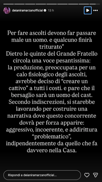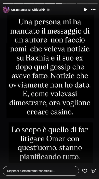 L’esperta di gossip Deianira Marzano ha spiegato di essere stata contattata da un autore della redazione del GF in cerca di notizie su Rasha Younes, nella speranza di trovare nuovi spunti per creare tensioni con Omer. “Lo scopo è quello di farli litigare” – scrive la Marzano – “Stanno pianificando tutto”.
