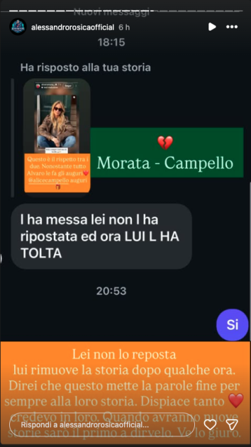 C’è chi sostiene, però, che la realtà sia tutt’altra. Secondo il blogger Alessandro Rosica, ad Alvaro non sarebbe andato giù il fatto che Alice non avesse ricondiviso la storia sul suo profilo e abbia poi deciso di cancellarla. Questo confermerebbe che tra loro le cose sono tutt’altro che migliorate e che la crisi è ormai irrecuperabile.