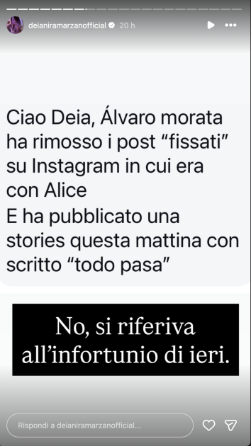Poco prima, un altro indizio: come riporta Deianira Marzano, esperta di gossip, con una storia sul suo profilo Instagram Álvaro avrebbe rimosso i post fissati sul suo profilo in compagnia di Alice e, poco dopo, ha condiviso una storia piuttosto criptica con la scritta “Todo Pasa”, come a voler significare che anche la storia fra i due fosse “passata”.