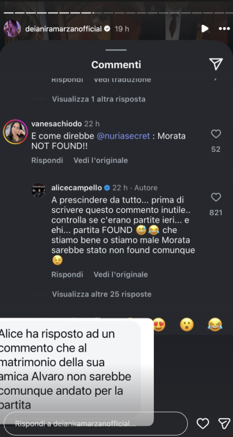 Stanca delle innumerevoli voci sul loro rapporto, la Campello ha deciso di rispondere a uno dei tanti commenti che facevano notare l’assenza del marito, spiegando che Álvaro non poteva accompagnarla perché impegnato nella partita di sabato tra l’Inter e il Como, la squadra dove gioca proprio Morata.