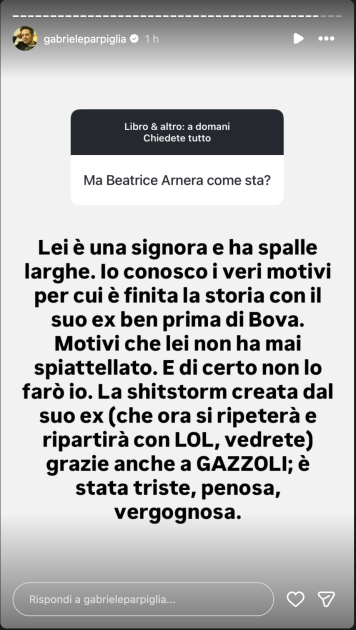 Il giornalista ha aperto un box domande per i suoi follower e non poteva mancare una domanda su Beatrice. Parpiglia ha spiegato che l’attrice “ha le spalle larghe”. Ha ribadito che non c’è stato alcun tradimento tra lei e Pisani e che la relazione con Bova è iniziata quando i due si erano già lasciati.