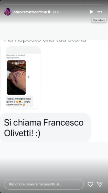 Tutti i suoi fan si sono chiesti quale fosse l’identità del nuovo fidanzato di Giorgia. A dare un nome e cognome al bel ragazzo ci ha pensato l’esperta di gossip Deianira Marzano. Attraverso una delle sue storie, infatti, si legge chiaramente il nome: Francesco Olivetti.