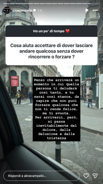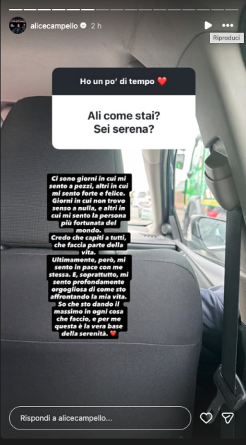 La modella ha aperto un box domande per i suoi follower, dando risposte molto sincere e genuine. In una delle storie, ad esempio, Alice ha detto chiaramente che ci sono giorni in cui si sente a “pezzi” e in cui “non trova più senso a nulla”, mentre in altri va decisamente meglio. Oggi può dirsi orgogliosa di come sta affrontando la sua vita.