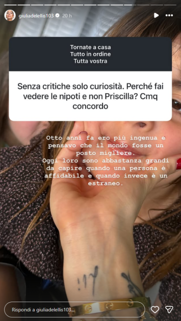 Un fan ha fatto notare che in passato Giulia aveva mostrato spesso i suoi nipoti sui social. L’influencer ha risposto senza esitazioni: “Otto anni fa ero una persona più ingenua, pensavo che il mondo fosse un posto migliore”. Oggi, invece, i suoi nipoti sono abbastanza grandi per capire “quando una persona è affidabile e quando invece è un estraneo”. Una riflessione che sottolinea come la sua visione sia cambiata nel tempo.