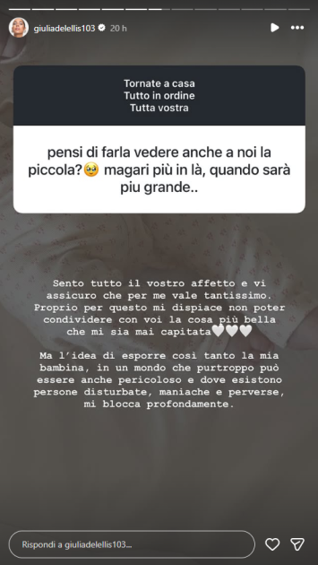 La scelta di oscurare il volto della figlia, nata lo scorso 7 ottobre, ha sorpreso molti. Alcuni si aspettavano un approccio simile a quello di Chiara Ferragni, che in passato aveva condiviso spesso momenti della vita dei suoi bambini. Ma Giulia ha spiegato che la decisione è stata presa per tutelare Priscilla. “Sono molto dispiaciuta di non condividere con voi la cosa più bella della mia vita”, ha ammesso, aggiungendo però che “il mondo può essere pericoloso, con persone disturbate, maniache e perverse”. Una scelta condivisa con il compagno Tony Effe, che ha messo al primo posto la sicurezza della bambina.