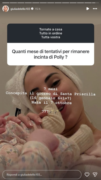 Giulia ha anche rivelato un dettaglio curioso sulla concezione di Priscilla. Rispondendo a un utente che le chiedeva per quanto tempo avesse provato a rimanere incinta, ha raccontato: “Sette mesi. È stata concepita il giorno di Santa Priscilla (16 gennaio: 6+1 fa 7) ed è nata il 7 ottobre”. Un legame speciale con il numero 7, che ha definito il suo numero fortunato.