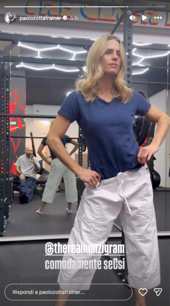 Alcune settimane fa, in compagnia di Paolo Zotta, uno dei personal trainer più richiesti dai vip, aveva pubblicato alcuni video che la ritraevano mentre si scatenava su Ice Ice Baby di Vanilla Ice. Stuzzicata dal suo allenatore, la conduttrice si era lanciata in mosse provocanti, ovviamente fatte nel modo più goffo e divertente possibile.