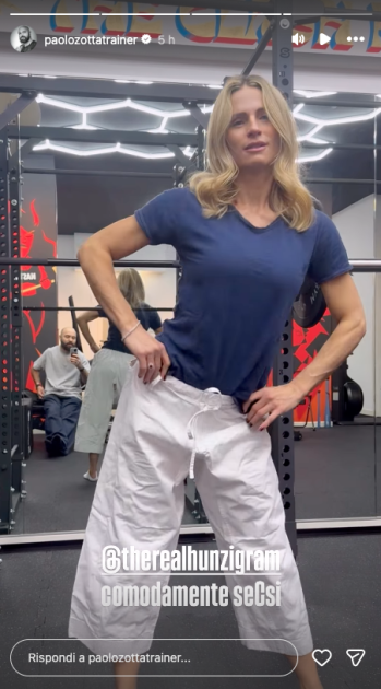 Un siparietto simile si è ripetuto poche ore fa. Nel video Michelle è intenta a muovere il bacino sciogliendo i muscoli. Il personal trainer la provoca scherzando sull’outfit scelto per la palestra. Lei, stando al gioco, ha risposto: “Comodo per essere da guerra, vorresti che fossi più sexy”.