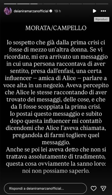 Ora sulla coppia si è espressa anche Deianira Marzano. L’esperta di gossip ha pubblicato alcuni messaggi ricevuti che confermerebbero le voci su Morata, ovvero che frequenterebbe da tempo una donna che lavora nel team del Como.