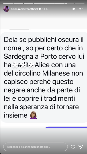 Questo famoso annuncio, però, non è mai arrivato. Al momento l’unica a intervenire è stata Alice Campello, che in alcune occasioni ha risposto sui social ad alcuni commenti prendendo le difese del marito.