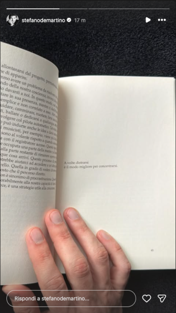 Ora ha mostrato una citazione molto particolare: “A volte distrarsi è il modo migliore per concentrarsi”. È una frase del produttore Rick Rubin inserita nel libro “L’atto creativo: un modo di essere”. De Martino l’aveva già mostrato insieme ai tanti altri libri che sta “studiando” in queste settimane proprio per prepararsi a Sanremo.