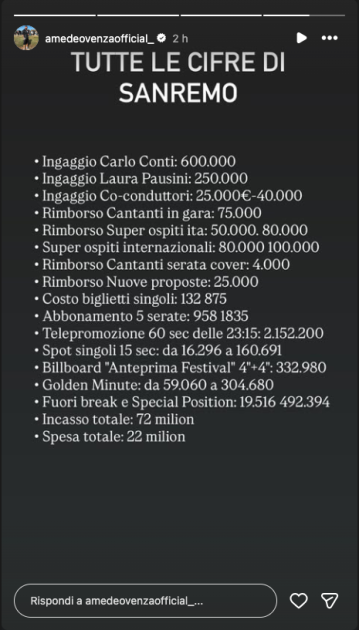 Venza ha anche riportato una stima della spesa di tutto Sanremo 2026: 22 milioni di euro, ovvero circa un terzo rispetto all’incasso totale di 72 milioni. Ovviamente si tratta di gossip e la Rai non ha mai comunicato le cifre ufficiali, ma aiutano a ridimensionare le polemiche sui cachet di chi partecipa al Festival.