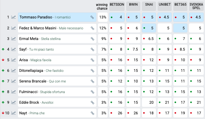 Finora, però, sulle canzoni non si sapeva nulla. Gli artisti hanno sì dato dei piccoli indizi nelle prime interviste rilasciate, ma senza svelare mai troppo sulla canzone. I bookmaker, al momento, si sono basati quindi solo sulla popolarità degli artisti in gara e sull’hype creato su alcuni di loro.