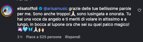La risposta di Elisa non si è fatta attendere ed è arrivata direttamente sulla pagina Instagram di RDS. Parole piene di affetto, ma senza sbilanciarsi sul futuro: “Grazie delle tue bellissime parole per me. Sono anche troppo! Sono lusingata e onorata. Tu hai una voce da angelo e ti meriti di volare in altissimo e a lungo, in bocca al lupone ora che sei su quel palco!”. Un messaggio elegante, che restituisce il complimento ad Arisa e celebra il momento che la cantante sta vivendo sul palco dell’Ariston.