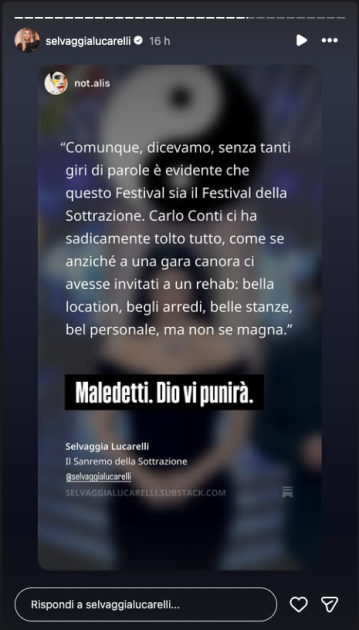 Lo ha poi ribadito ieri, dopo la prima puntata e, poche ore fa, ci è andata ancora più pesante. Nonostante votasse la sala stampa, notoriamente più accurata e attenta alle canzoni di qualità rispetto al pubblico generalista, nessuno dei Big che l’ha davvero convinta – in particolare Fulminacci, Ditonellapiaga e Levante – è finito nella top 5.