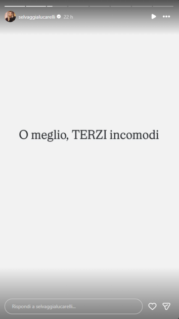 È stata poi la stessa Selvaggia a riprendere l’indovinello lanciato da Giuseppe Candela, che ha commentato così: “i famosi terzi incomodi”. Poco dopo ha scelto di rimarcare il concetto, sottolineando ancora di più, con l’utilizzo delle maiuscole in una seconda storia, proprio quel “TERZI” già anticipato anche dal giornalista Gabriele.