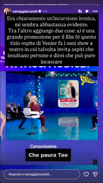 L’opinionista del Grande Fratello Vip, con una storia su Instagram, ha spiegato che quella di Mammucari era chiaramente un’incursione “ironica” e che il caos che ha generato farà una grandissima promozione al film. In più ha tirato una frecciatina a Peppe Iodice — tra l’altro senza nominarlo esplicitamente — dicendo che nei suoi spettacoli ha spesso ospiti con comportamenti non così diversi da quelli di Mammucari.