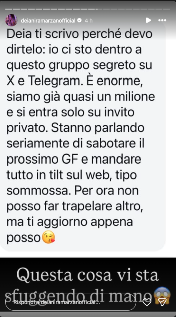 Secondo quanto riportato da Deianira Marzano, esisterebbe un gruppo su Telegram con migliaia di utenti dedicato al festival che potrebbe ostacolare la normale riuscita della prossima edizione del GF Vip. L’esperta di gossip non ha voluto dare altri chiarimenti, limitandosi a pubblicare il messaggio ricevuto sui social.