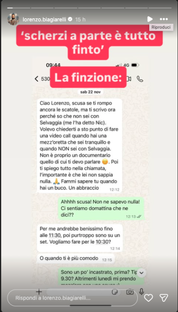 La puntata con il suo scherzo andrà in onda stasera, il 9 marzo, ma già da qualche giorno Selvaggia ha iniziato a leggere i commenti di chi sosteneva che il suo scherzo fosse del tutto finto. Per smentire i gossip, poche ore fa il suo fidanzato Lorenzo Biagiarelli ha pubblicato una lunga serie di messaggi che fanno capire come la redazione del programma stesse preparando lo scherzo.