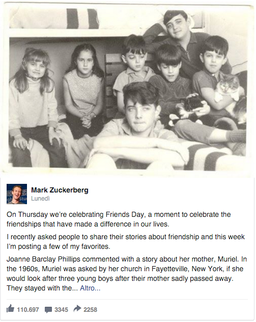 Infatti, il celebre social network che basa il principio dei legami tra profili, esattamente con il concetto di ‘amicizia’, ha dato il via ai festeggiamenti per il dodicesimo anno proprio così: lanciando questa ‘campagna’ dedicata agli amici fisici e tangibili (più che virtuali) e lo fa per mano del suo fondatore che sul post ha scritto «Giovedì festeggeremo il ‘Friends Day’, un momento per celebrare le amicizie che hanno fatto la differenza nella nostra vita».