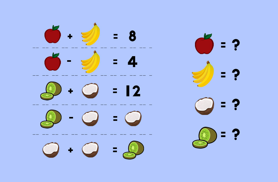 La soluzione? Mela = 6 Banana = 2 Cocco = 4 Kiwi = 8